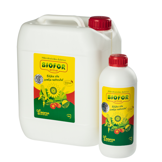 Biofor Active je mikrobiološki preparat – tečno mikrobiološko đubrivo u obliku koncentrovanog rastvora, namenjen za prihranu biljaka. Preparat omogućava biljkama optimalan i kontinuiran unos hranljivih materija, čime se poboljšava njihov rast i razvoj. Biofor Active obezbeđuje biljkama ključne hranljive materije: azot (N), fosfor (P) i kalijum (K), neophodne za zdrav rast i visoke prinose. Prihrana biljaka preparatom Biofor Active doprinosi postizanju stabilnih prinosa i očuvanju zdravlja useva, čineći ga idealnim izborom za poljoprivrednike koji žele da unaprede kvalitet svoje proizvodnje. Upotrebom ovog preparata, poljoprivrednici mogu postići veće prinose, otpornije useve i brojne prednosti zahvaljujući povećanju mikrobiološke aktivnosti zemljišta. Biofor Active je neizostavni deo Biološki tretman zemljišta tehnologije.